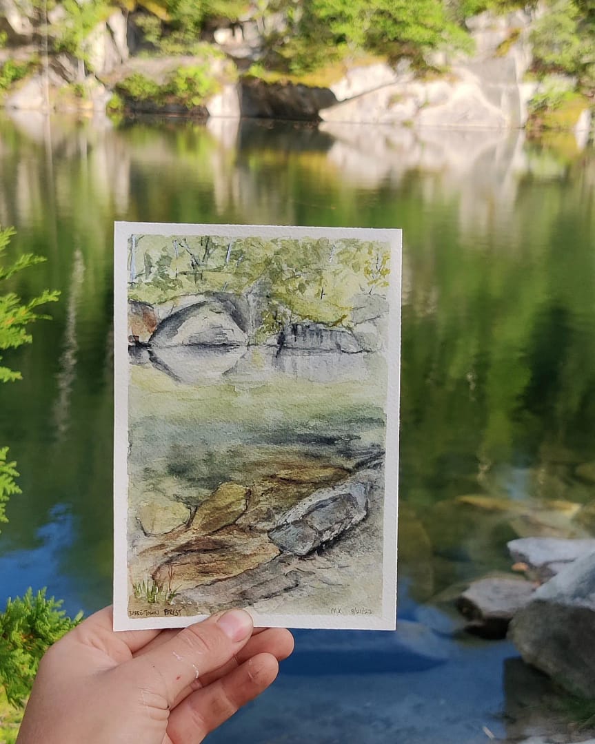 Original watercolor – not a print – painted plein air at one of the old quarries in Barre, Vermont. I used water from the quarry to activate my paints, so by buying this painting you are bringing home a part of the quarry. This painting is unmounted and unframed.